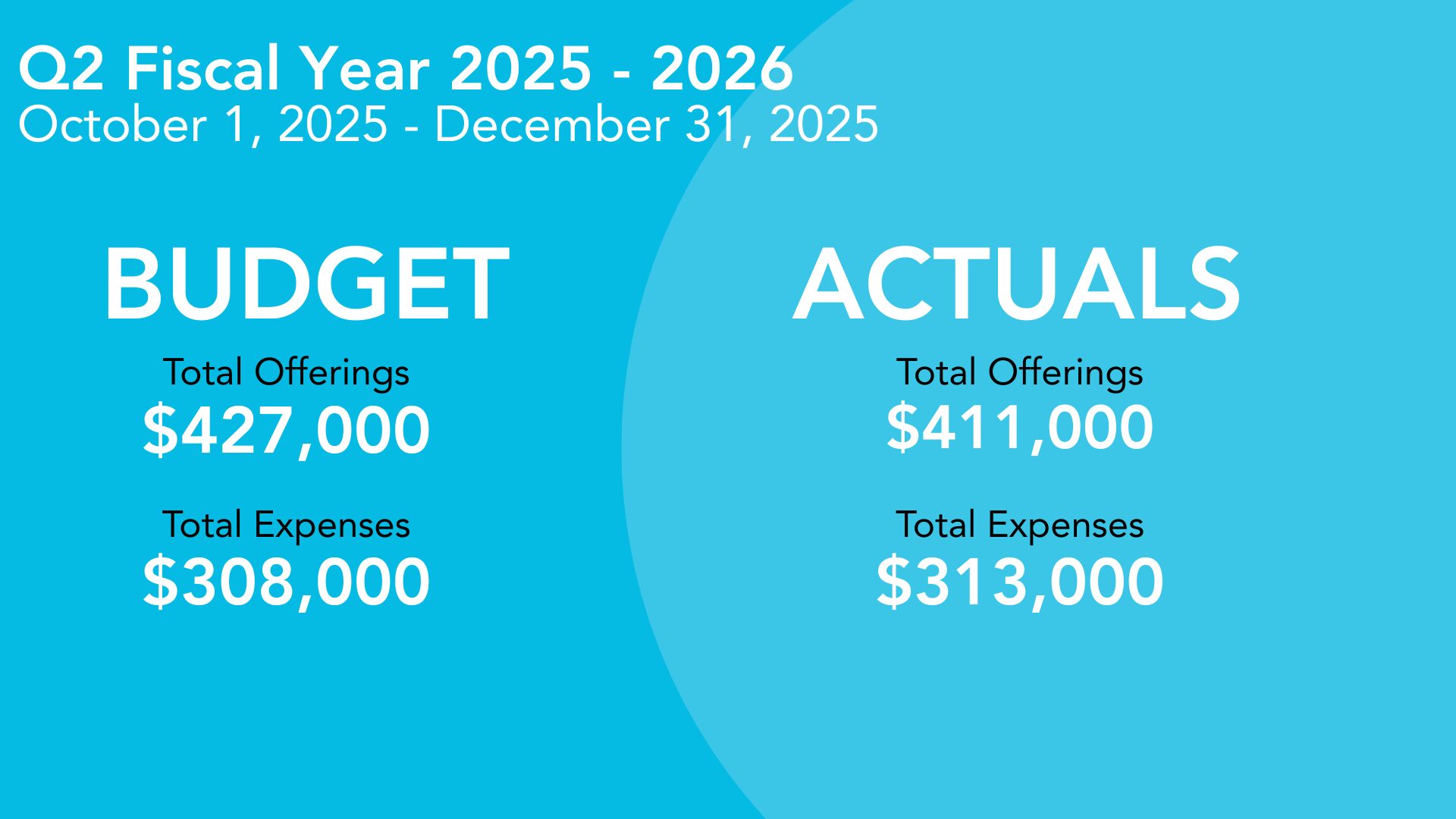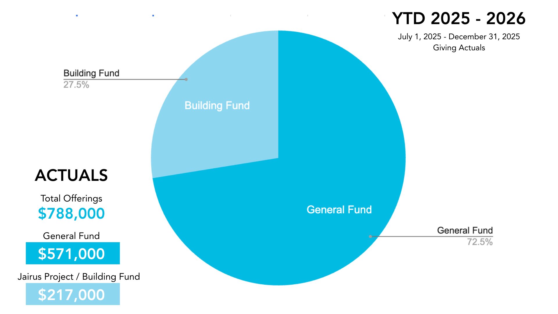 In Q2 of the 2025/2026 budget, we saw an approximate 3% increase in our General Fund giving compared to the same period last year. Our Building Fund saw an increase of just over 10% compared to Q2 of 24/25, largely due to the continued fundraising efforts of the Jairus Project. Overall, we are trending in the right direction and all ministry areas continue to be fully funded to achieve the goals set out at the beginning of the fiscal year.