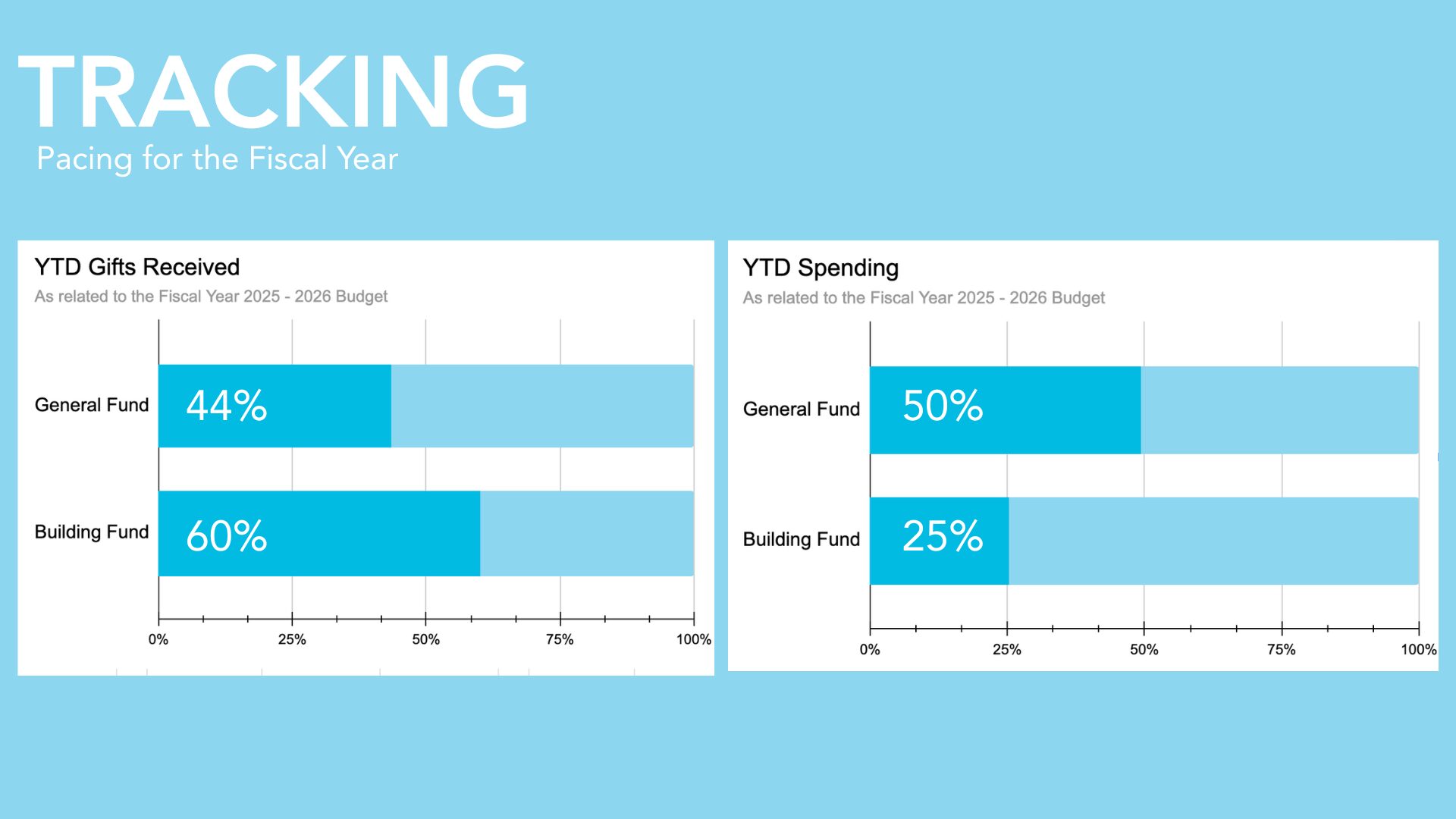 The charts to the left show our relative pacing of both our anticipated offerings and our actual expenditures for the General and Building Funds through the Fiscal Year. Our staff will continue to steward their spending wisely as we progress into Q3 of the fiscal year and soon begin preparations for writing the 2026/2027 budget.